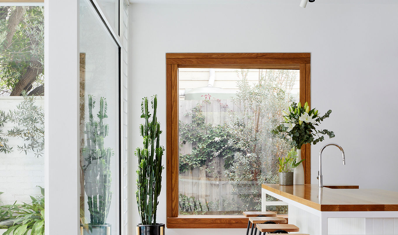 This Edwardian-style home in Elsternwick preserves its original front façade while incorporating a double-storey extension and landscaped area to improve functionality. The design integrates heritage features with modern architecture to meet the needs of contemporary living. The weatherboard façade transitions seamlessly into the modern extension, unified by white paint and complemented by brick, hit-and-miss brick, and timber shutters. Inside, solid timber-framed window seats enhance the open-plan kitchen, living, and dining areas, providing practicality and aesthetic warmth. Natural light floods the space, with east-facing bedrooms capturing morning sun, while the rear living spaces benefit from northern exposure, optimizing both daylight and energy performance. The backyard is designed as a private retreat, featuring a pool, deck, outdoor shower, BBQ pod, and lush garden. This renovation integrates heritage preservation with modern design, creating a sustainable, functional home that respects and enhances Elsternwick’s architectural character. Photos by Tatjana Plitt